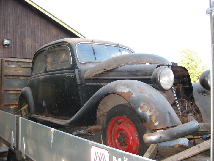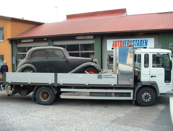 At sellers location. The old wreck is loaded onto the truck. According to the registration documents the car was first registered in January 1951 as a 170 Va. But during 1953 the car was "modified" to a 170 Vb instead, why is unknown. During the period the car was used and registered, it had a total of five different owners until January 1963 when the car was unregistered and sold as scrap to a scrap dealer. However, the car was not scrapped, and have since then probably wandered between various owners, therefore the cars history the last 45 years is unclear.