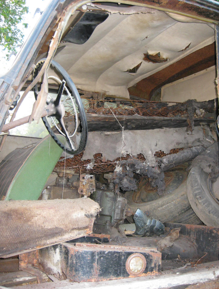 Interiören, med resterna av ett baksäte ovanpå däcken, och inunder syns skymten av två växellådor och några stötfångardelar.