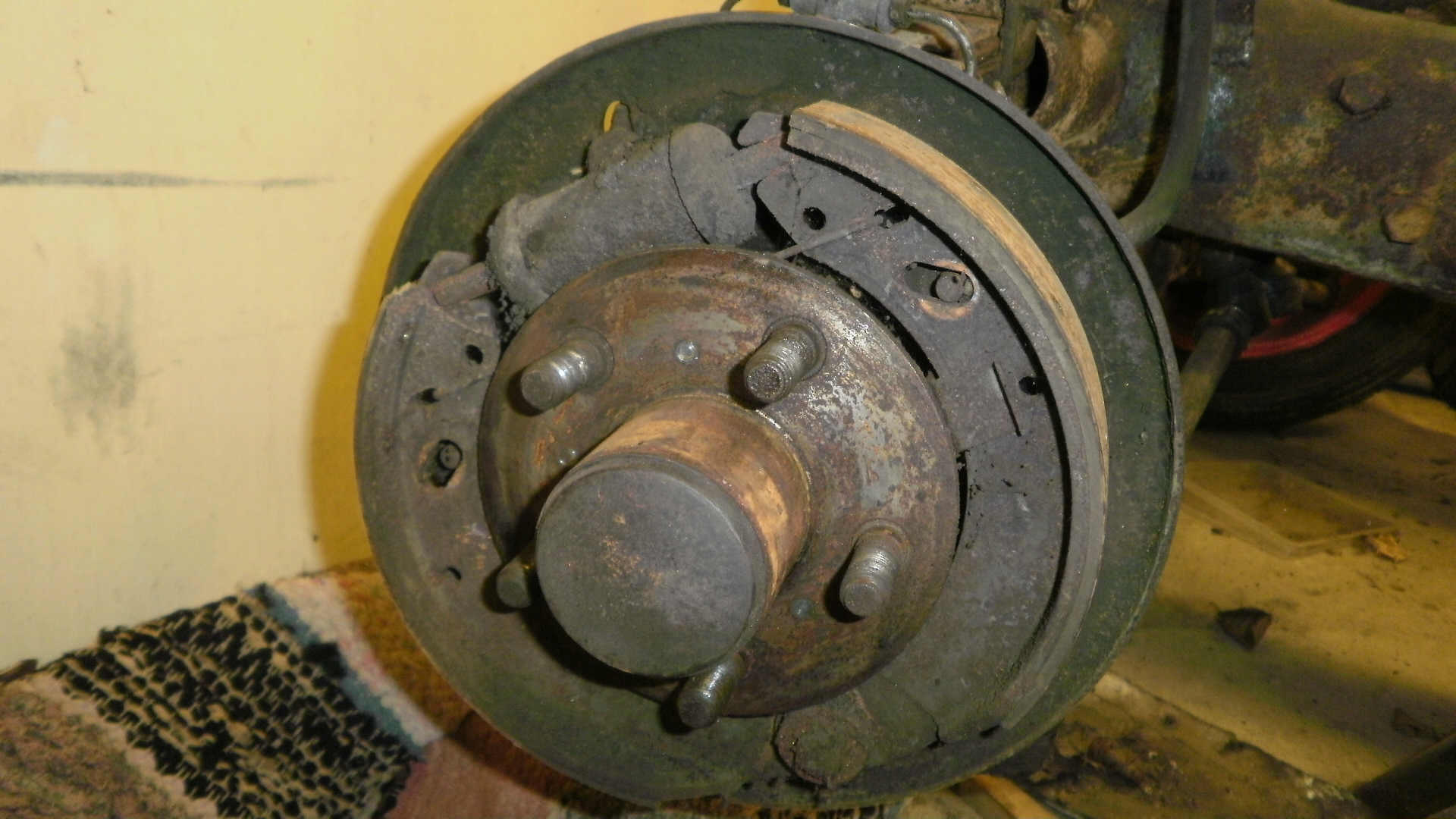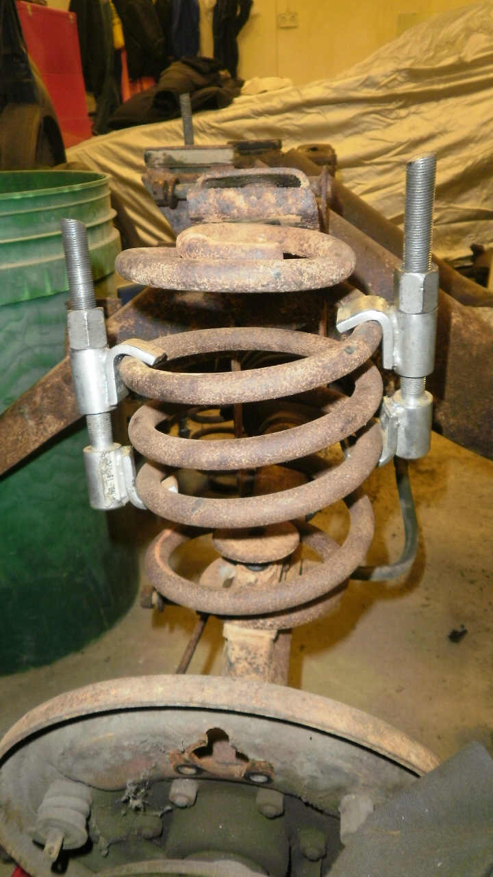 Vänster bakaxeldel. Fjädern är hopklämd för att kunna demonteras.