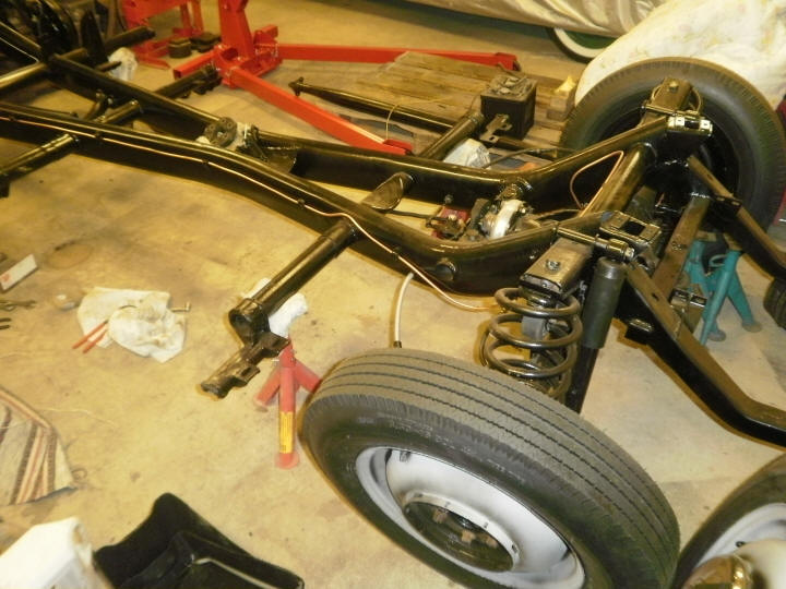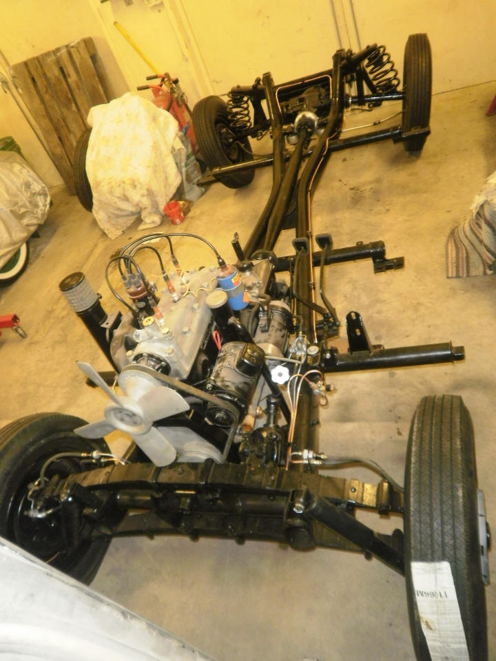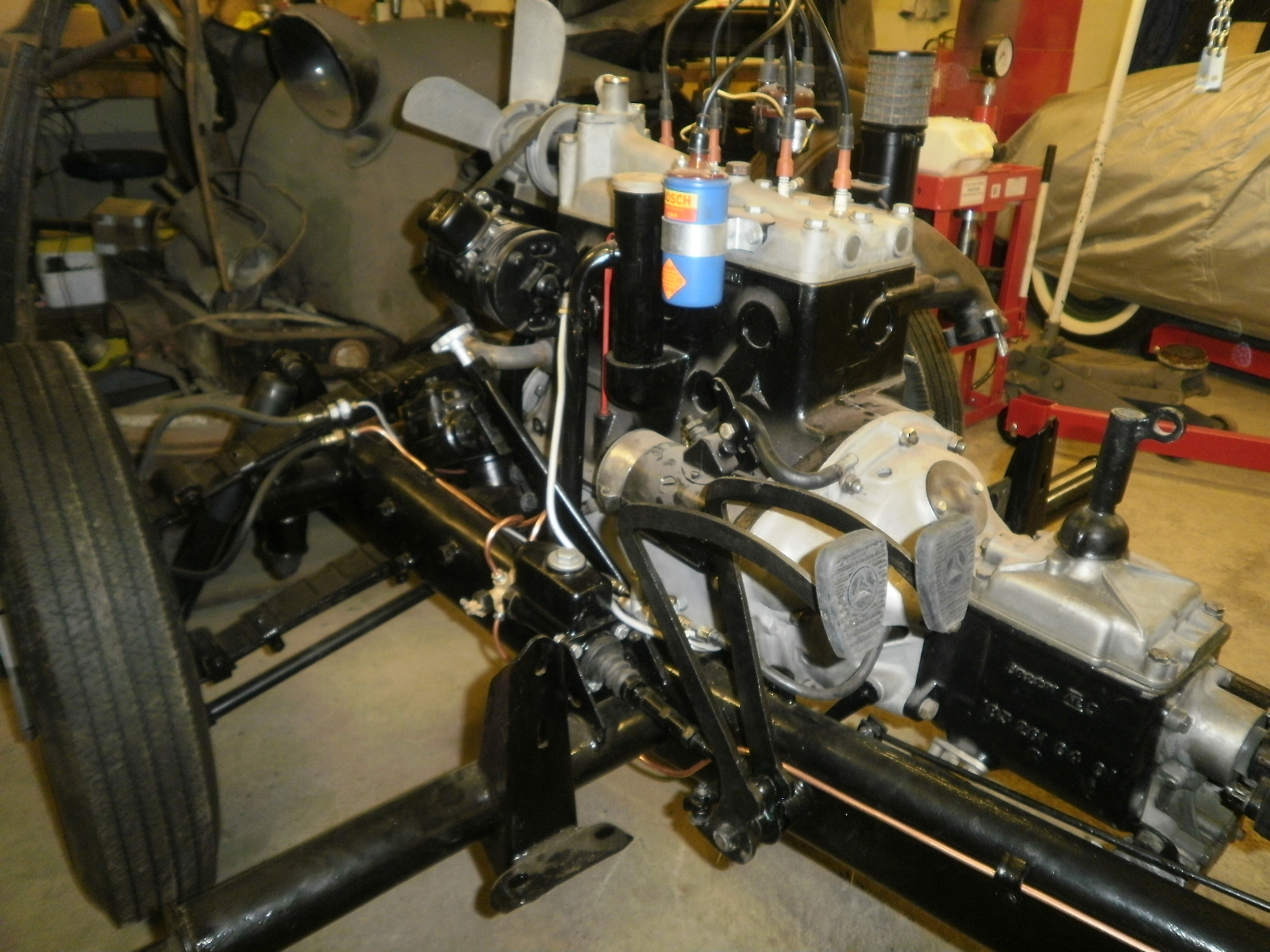 The chassis is now complete. Parking brake system, engine mounts, central lubrication, clutch and brake pedals was installed before the engine and gearbox were lifted into place.