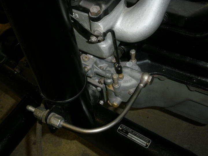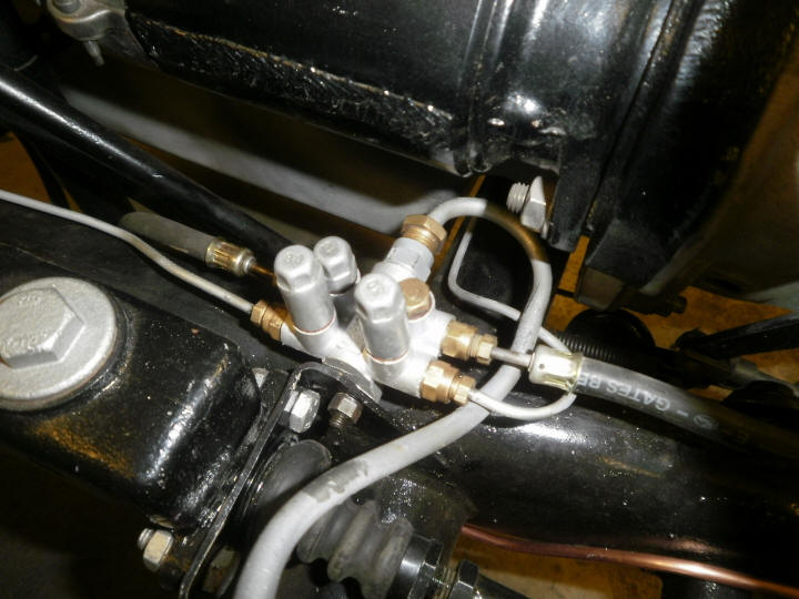 Distributionssenheten för centralsmörjningen. Härifrån leds olja ut till styrlederna, framvagnens spindelleder och urtrampningslagret. Närmast i bild sitter huvudbromscylindern, överst syns nedre delen av startmotorn. Alla rören var i fint skick och behövdes bara rengöras och målas. Slangarna var ett problem då det var svårt att hitta nya som passande. Men det löstes genom att återanvända de gamla kopplingarna i ändarna. En slangfirma pressade helt enkelt dit ny slang på de gamla kopplingarna.