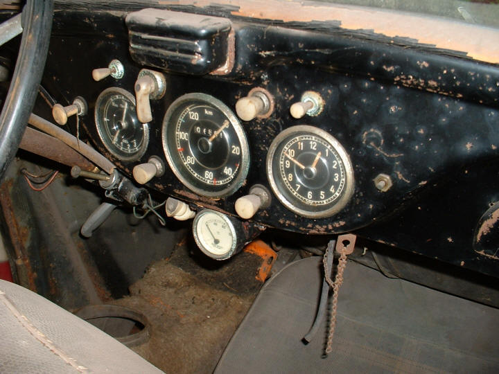 The instrument panel with the instruments when the restoration begun. At the far left there is a instrument with fuel gauge and oil pressure gauge combined. The speedometer is located in the middle, and on the right side there is a watch, purely mechanical. Below the panel there is a temperature gauge for the engine coolant system. It was not original, but a common add-on.