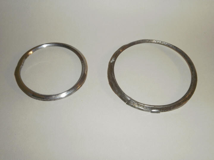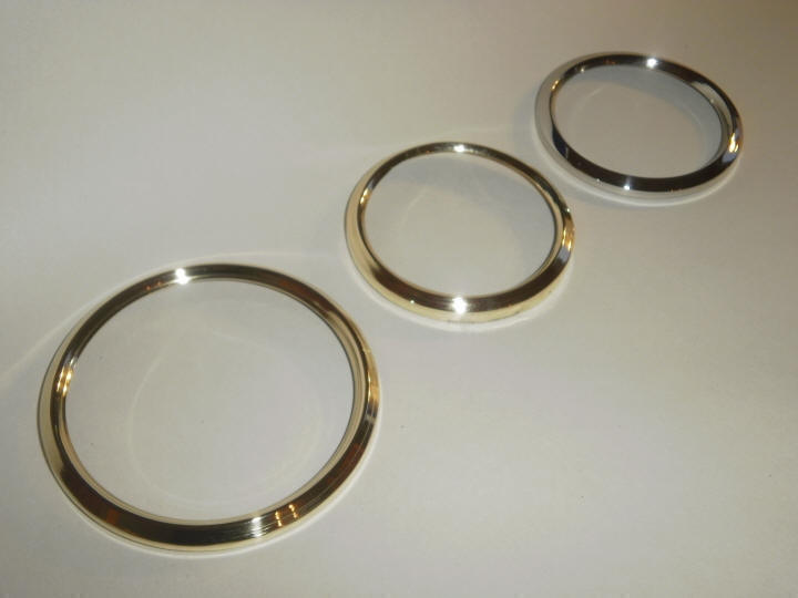 New chrome rings. These were made using thin sheet of brass that was shaped by a template in a lathe, then polished and nickel plated. The ring on the right is finished, the other two are still not nickel plated.