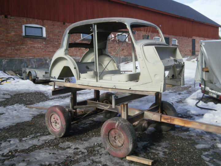 Back in the workshop. In order to stabilize and minimize the risk of body becoming warped during the welding work, the body will be fixed at the chassis.