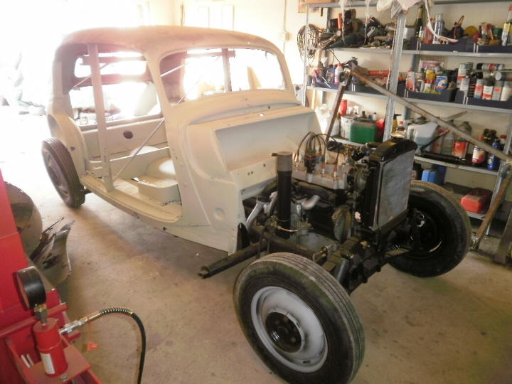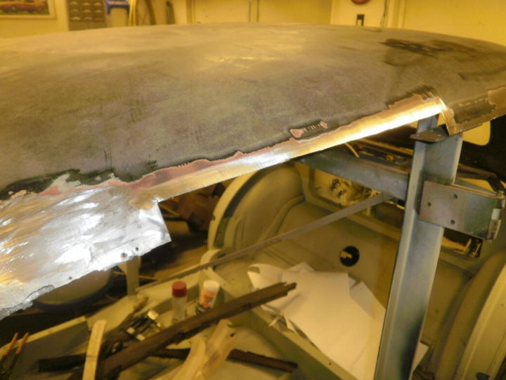 Karossen blästrad och grundlackad. Endast den nedre - robusta halvan - blästrades. Taket är ömtåligt eftersom det mer eller mindre ligger helt löst p.g.a. att trästommen som det är fäst vid, har demonterats. Taket kommer att slipas för hand.