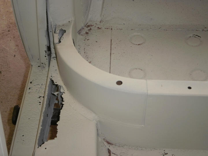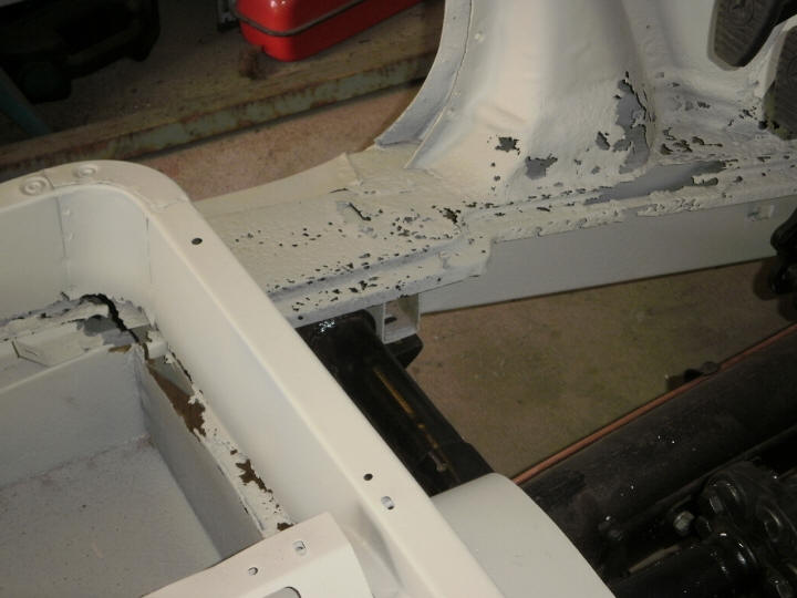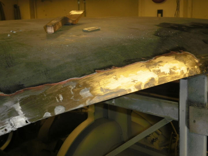 The body sand-blasted and primed. Only the lower - the more stable body half - was blasted. The roof is quite fragile due to the absence of the structural wood. The roof will be sanded by hand.