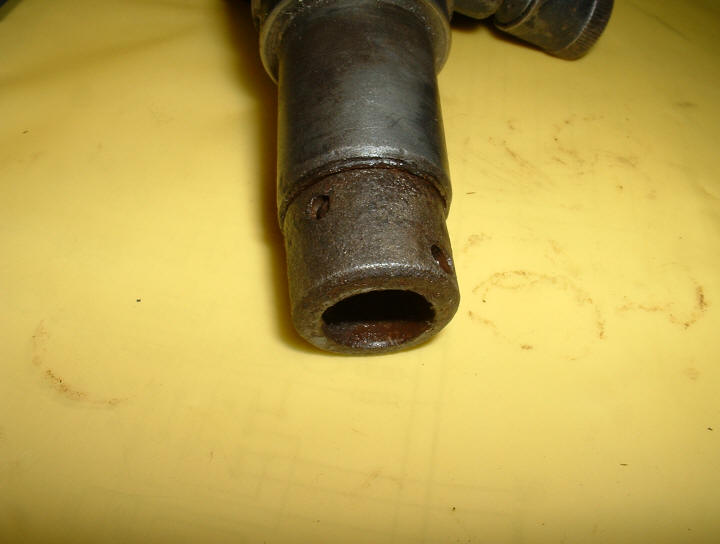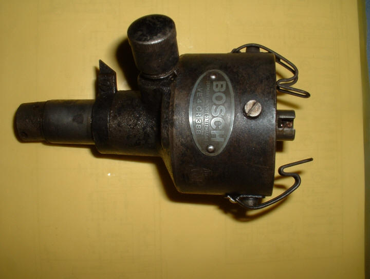 Originalfördelaren, en Bosch VE 4 CR 388. På bilden är själva drivaxeln borttagen (den som är går ner i motorblocket till oljepumpen). Fördelaren var i bra skick, men stiften och hålen i medbringaren till drivaxeln var väldigt slitna och glappa. För att tändningen ska bli exakt och motorn få en bra gång får det inte förekomma något glapp i överföringen från vevaxeln till fördelaren. Nya stift kommer därför att tillverkas och monteras.