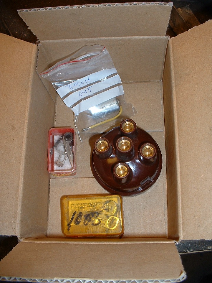 New ignition parts. Distributor cap, contact-breaker points and capacitor.